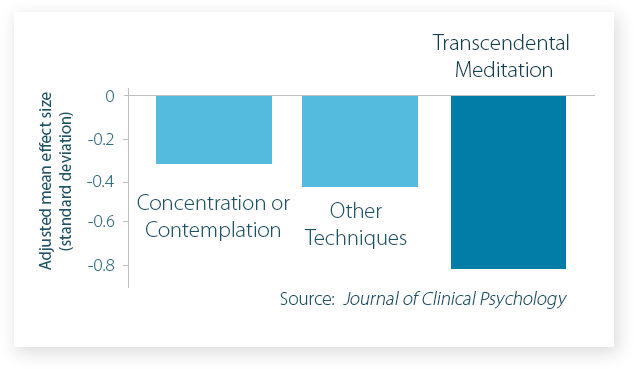 Researchers at Stanford University conducted a meta-analysis of 146 independent studies on the effect of various meditation techniques on anxiety. The study, published in the Journal of Clinical Psychology, found that the TM technique is twice as effective at reducing anxiety.